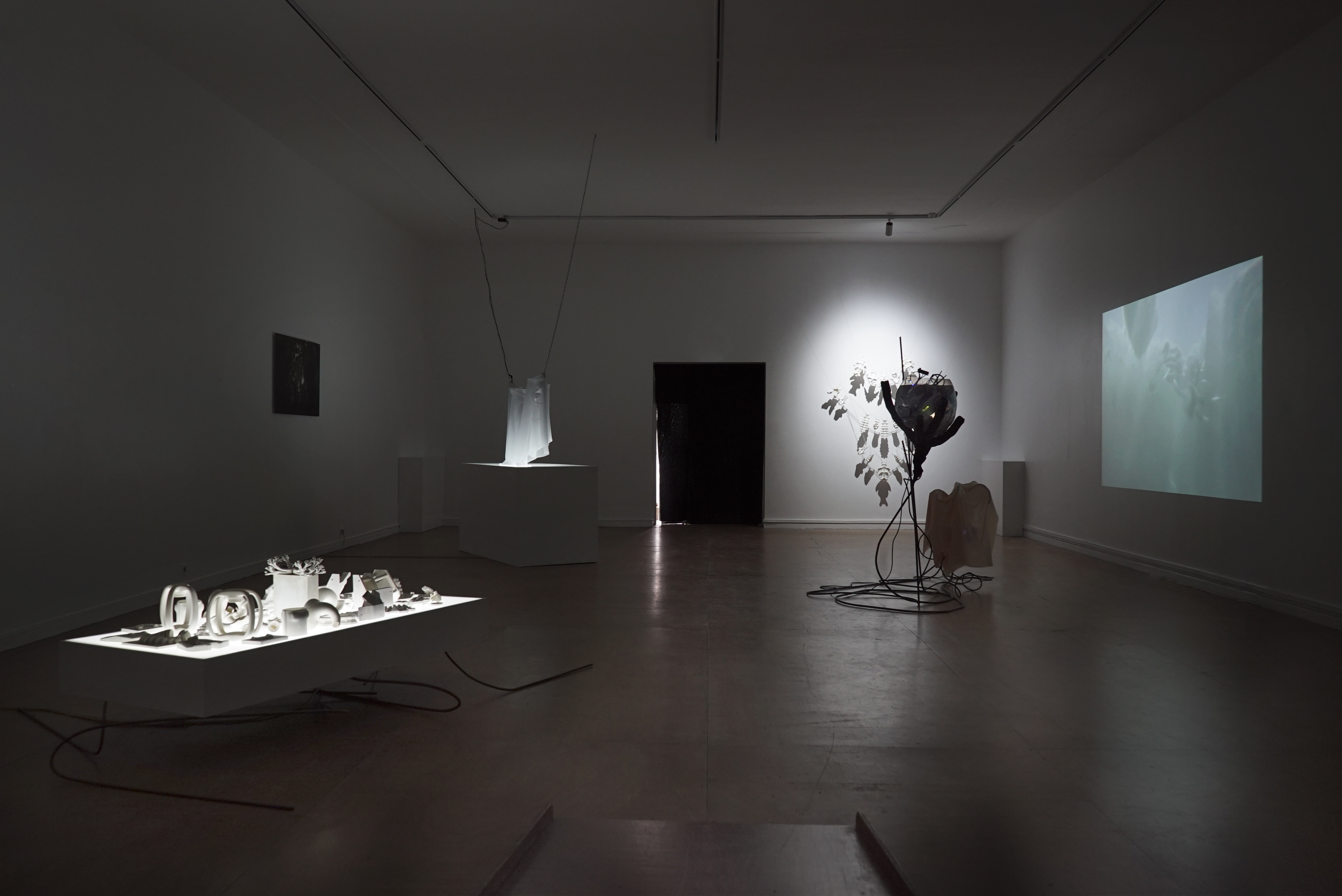 Armatures en métal, bois, ordinateurs, huile minérale, vasques en verre, videos-projecteurs, cablage.